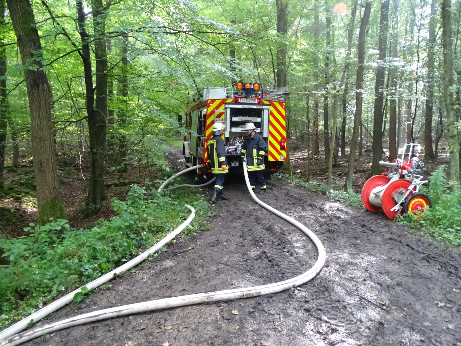 Das Übungsziel lautete jedoch 1000 Liter Wasserabgabe! Hierzu wurden die beiden LF20KatS in einem Abschnitt unter Führung eines Abschnittsleiters aus Stolberg zusammengefasst, welcher nach kurzer Absprache mit dem Einsatzleiter den Aufbau der Wasserversorgung koordinierte. Die beiden vorgenannten Fahrzeuge sind hierzu insbesondere mit jeweils 600 m B-Schläuchen, einer Tragkraftspritzen und einem Faltbehältern ausgestattet. Ein Teil des verlasteten Schlauchmaterials kann während der langsamen Fahrt direkt verlegt werden, so dass schnell eine „unterbrechungsfreie“ Löschwasserversorgung mit 1000 Liter pro Minute über eine Strecke von ca. 800 m sichergestellt werden konnte. Mit der Inbetriebnahme der Wasserversorgung aus dem Wehebach konnte der Pendelverkehr eingestellt werden.