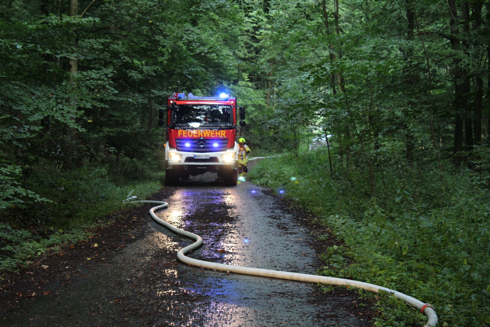 Da jedoch der Aufbau dieser langen Wegestrecke vom Wehebach bis zur Einsatzstelle einige Zeit in Anspruch nimmt, die Löschmaßnahmen aber schnell beginnen sollten, wurde in einem ersten Schritt die Wasserversorgung über einen Pendelverkehr mit drei Löschfahrzeuge von einem Hydranten aus Hamich sichergestellt. Hiermit konnte eine durchgehende Wasserabgabe von knapp über 300 Liter erreicht werden.